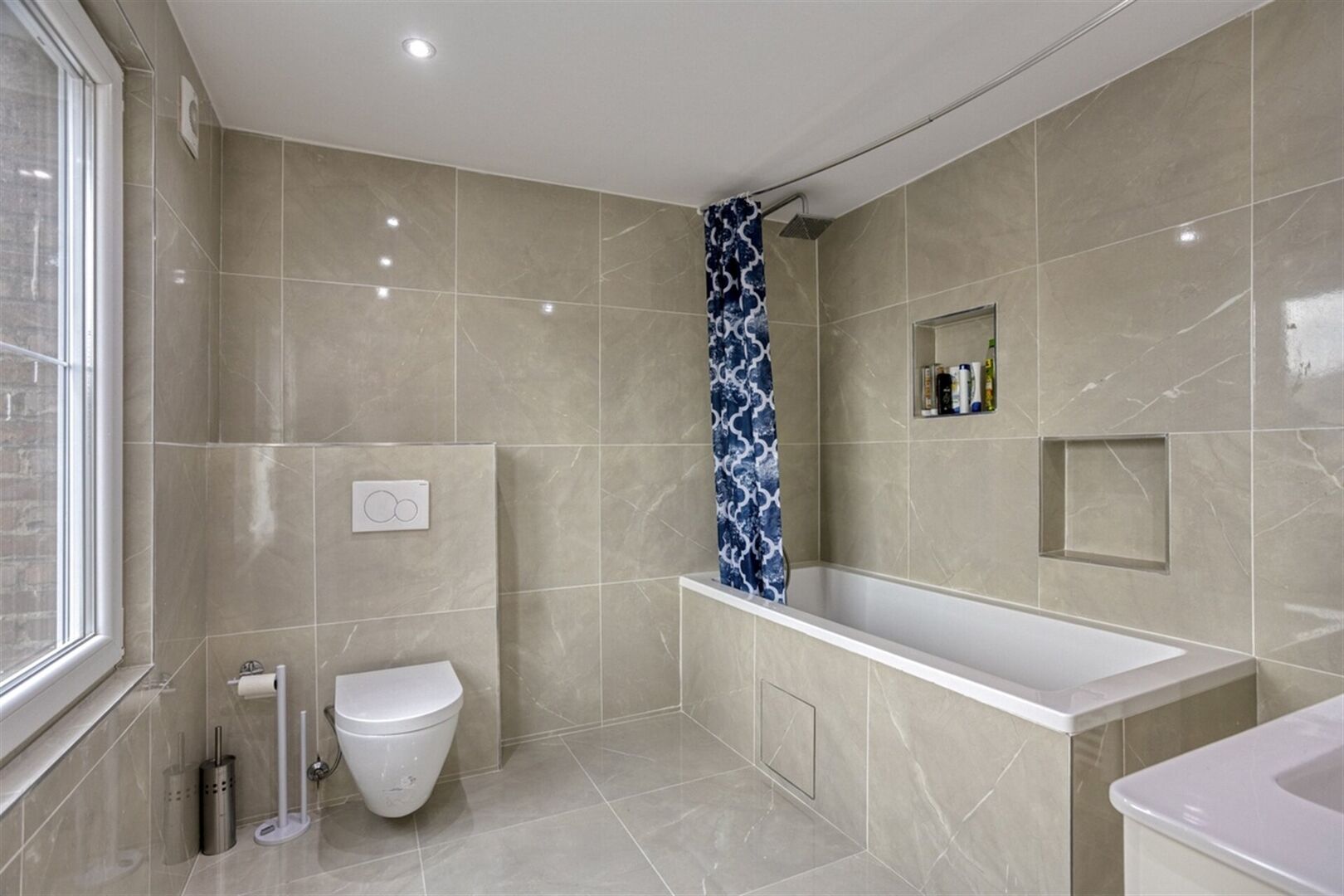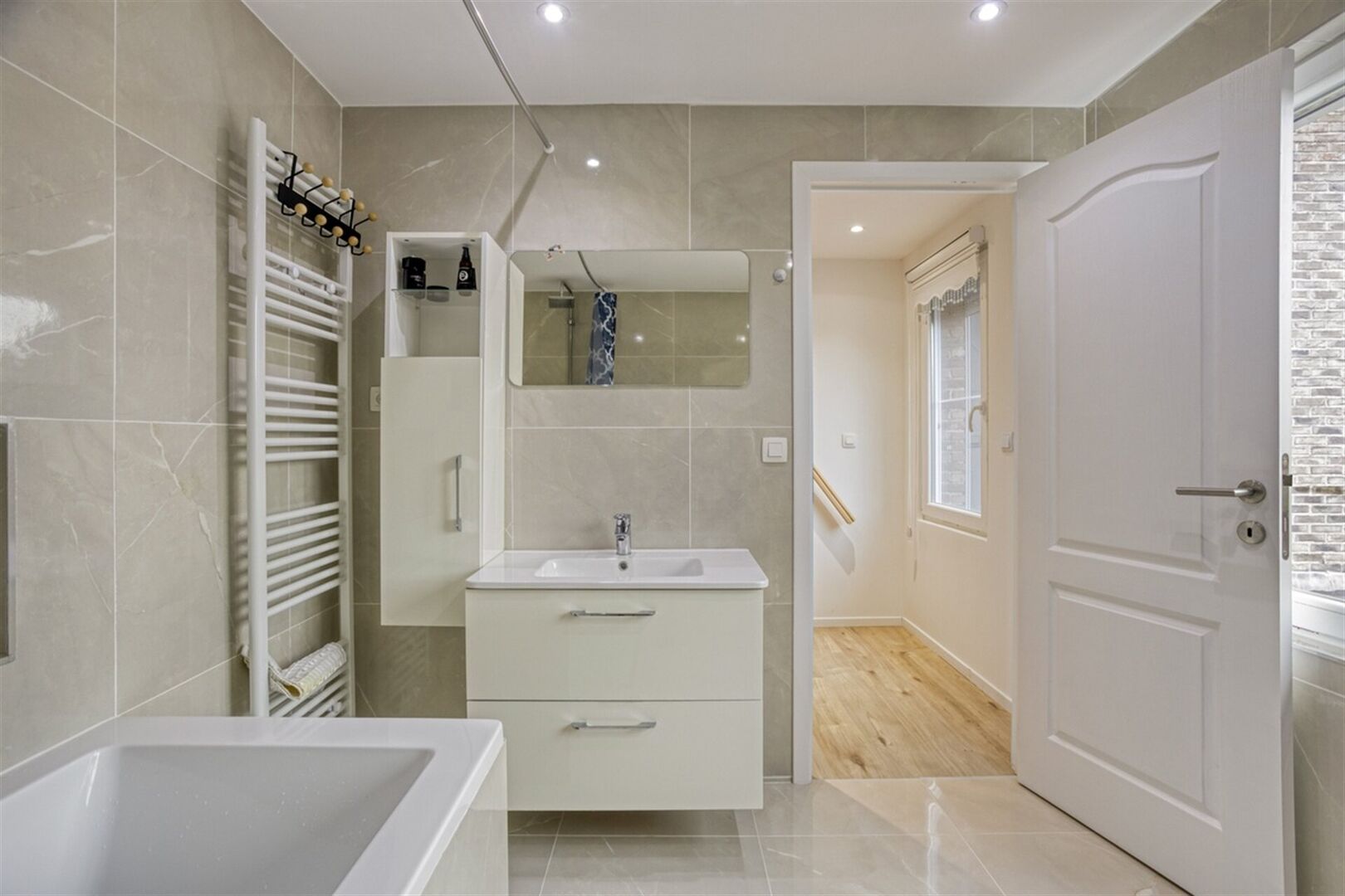 Le premier étage comprend une chambre confortable ainsi qu’une salle de bains moderne, équipée d’une baignoire avec douche intégrée, d’un lavabo et d’un toilette. Les tons clairs et les finitions soignées y créent une atmosphère apaisante.