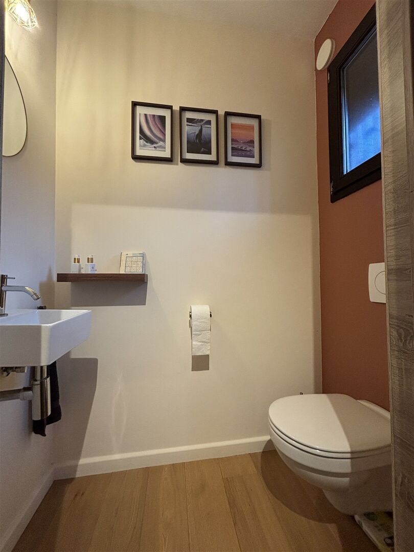 - 1er étage : salon avec cuisine ouverte, débarras, terrasse, toilettes