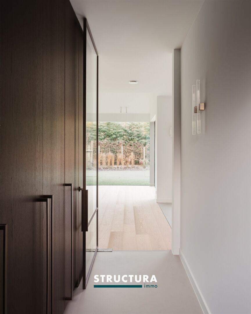 Vous accédez à la maison par un élégant hall d’entrée avec placards intégrés sur mesure et WC invités. Sur la gauche se trouve un bureau raffiné, équipé d’un mobilier sur mesure et de rangements intégrés – idéal pour combiner vie privée et activité professionnelle.