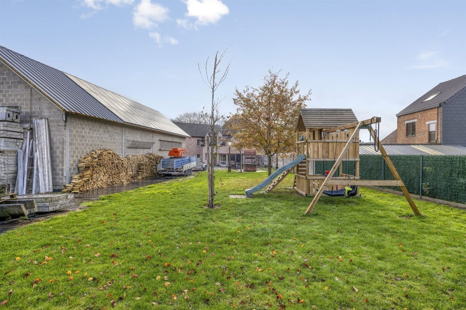 Remise/Loods: Sur le terrain se trouve une grande remise de 8 x 20 m + étage (+/- 240 m²) équipée d’une porte sectionnelle automatique. Idéal pour indépendants, stockage, atelier ou espace hobby.