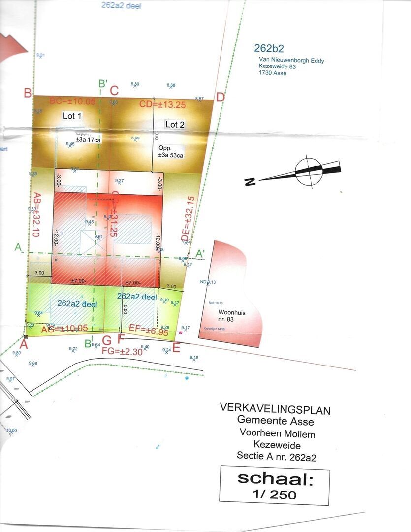 Il s’agit d’un terrain de 3a 43ca avec une largeur de 9,37 m. Le terrain à bâtir est indiqué comme lot 2 en jaune sur le plan.