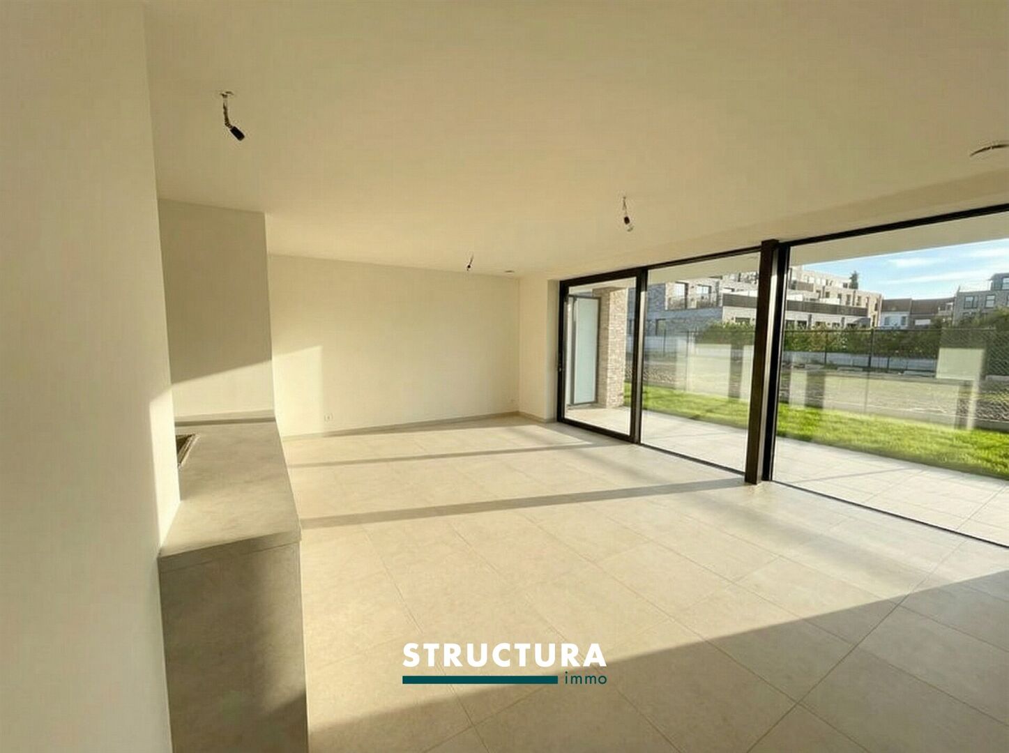De ruime en lichtrijke leefruimte biedt een aangename woonomgeving en sluit aan op een open, volledig uitgeruste keuken.