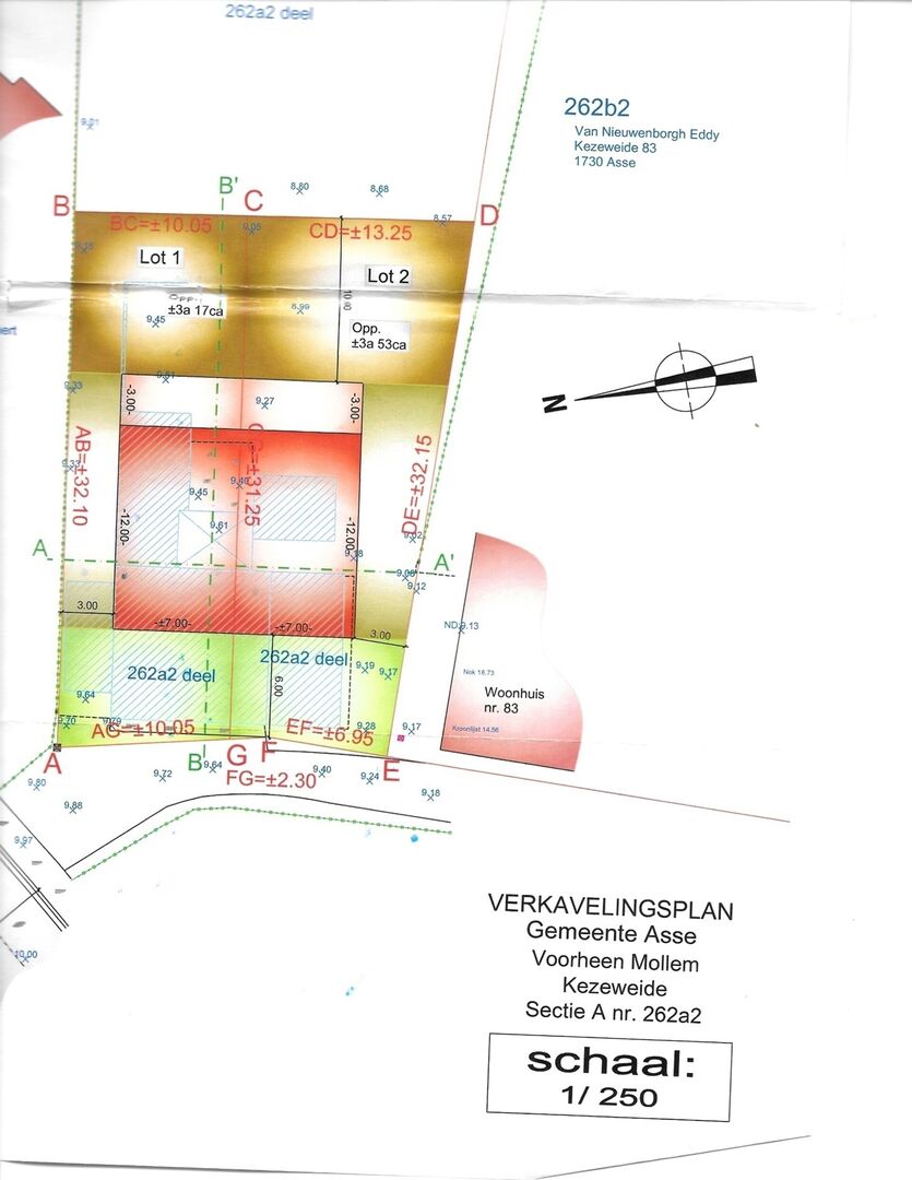 Het betreft een perceel van 3a 43ca met een breedte van 9.37m. (bouwgrond lot 2 aangeduid in het geel op plan)