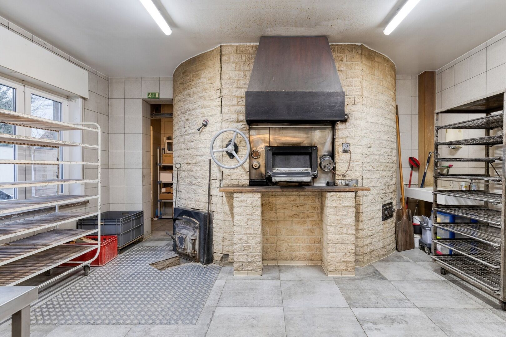 - Commerciële ruimte: Grote werkplaats/bakkerij met traditionele houtoven, aparte toegang via grote zijpoort