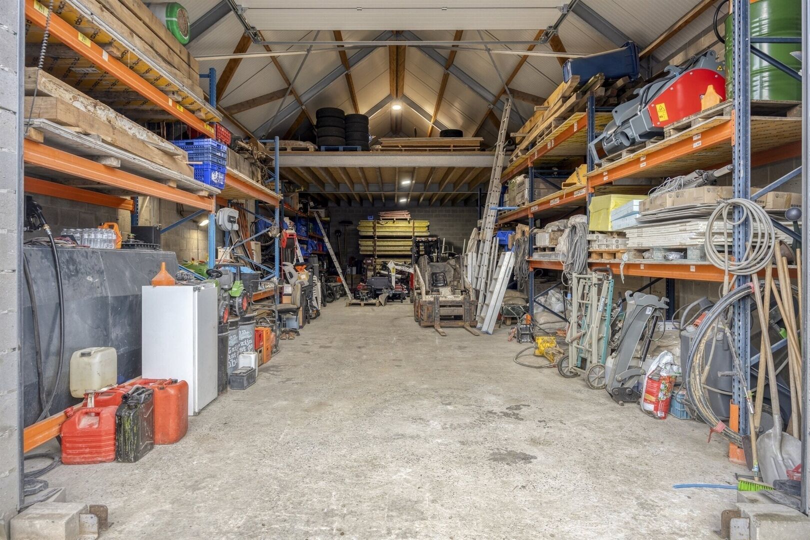 Op het terrein bevindt zich een grote loods van 8 x 20 m + verdieping (+/- 240m²), voorzien van een automatische sectionaalpoort. Ideaal voor zelfstandigen, opslag, atelier of hobbyruimte.