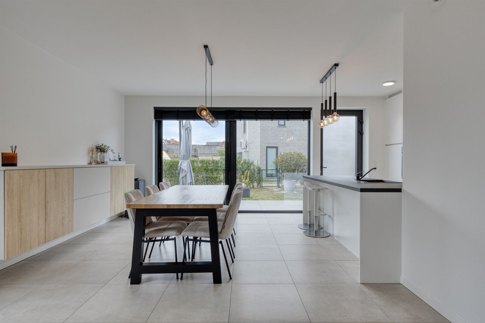 Aansluitend vindt u de strakke, volledig uitgeruste keuken met hoogwaardige toestellen. Hier wordt koken een plezier. Dankzij de directe verbinding met de eetruimte en de schuifdeur naar de tuin geniet u van een vlotte overgang tussen binnen en buiten – ideaal voor gezellige diners en zomerse avonden.