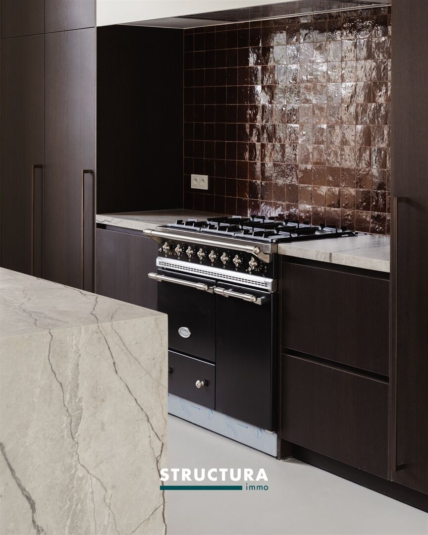 De volledig uitgeruste keuken beschikt over premium toestellen en een exclusief Lacanche-gasvuur als absolute blikvanger voor kookliefhebbers. Aansluitend bevindt zich een praktische berging met extra koelkast en diepvries, toegankelijk zowel via de woning als rechtstreeks van buiten via een deur met codeklavier.