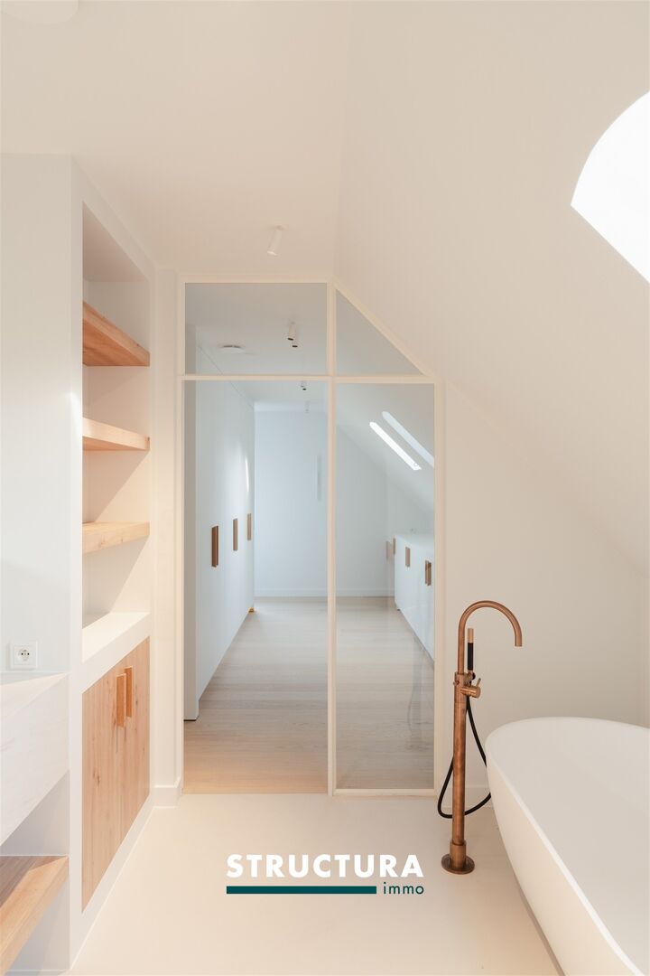 Op de bovenverdieping bevindt zich de luxueuze master suite met hotelallure. Deze royale ruimte omvat een ruime dressing en een stijlvolle ensuite badkamer met vrijstaand bad, inloopdouche en dubbel lavabomeubel. Ook de technische ruimte is hier discreet geïntegreerd.