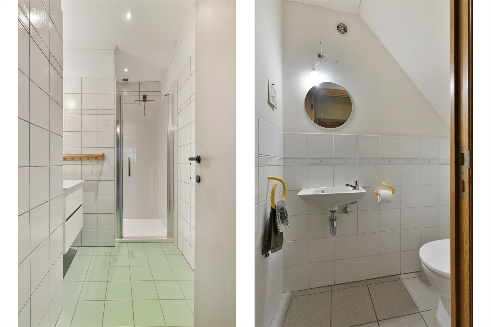 Gelijkvloers: inkomhal met gastentoilet, lichte leefruimte met zicht op de tuin, keuken, bureau/atelier (ideaal voor thuiswerk of hobby’s) en garage. Extra parkeerplaatsen voor de poort en de voortuin